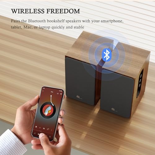 [𝗕𝗹𝘂𝗲𝘁𝗼𝗼𝘁𝗵 𝗕𝗼𝗼𝗸𝘀𝗵𝗲𝗹𝗳 𝗦𝗽𝗲𝗮𝗸𝗲𝗿𝘀] Pair with your Smartphone, Tablet, Mac or Laptop to play music wirelessly through the Bookshelf Speakers. Get rid of the restrictions of wired playback, and enjoy the fun of wireless playback.The turntable speakers can automatically reconnect to the last device used