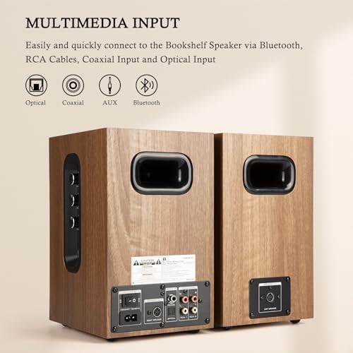 [𝗠𝘂𝗹𝘁𝗶𝗽𝗹𝗲 𝗶𝗻𝗽𝘂𝘁𝘀] Fully compatible with a variety of media devices via AUX and RCA cables (package included).. Easily connect to the Bookshelf Speakers via standard audio cable Connection, RCA, Coaxial, Optical input, and Bluetooth. Connect to two devices via dual RCA inputs at the same time, no plugging and switching needed