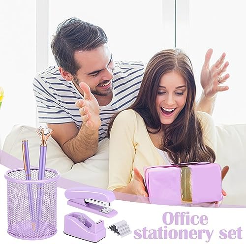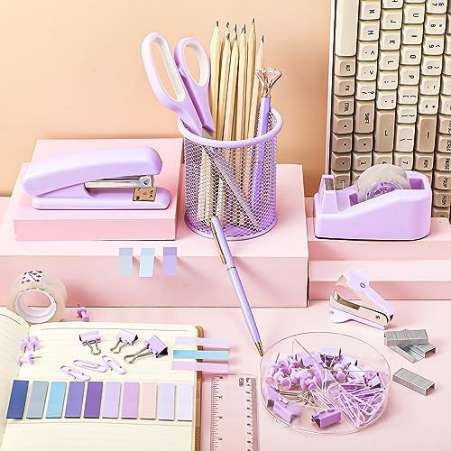 【Package Includes】You will receive a complete purple office supplies set, including 1 purple stapler, 1 purple tape holder, 2 clear tapes, 1 staple remover, 1 pen holder, 1000 24/6 staples, 1 scissors, 1 ruler, 1 tabs, 1 diamond ballpoint pen, 1 purple pen, 1 clip set (includes 30 paper clips, 7 large binder clips, 15 small binder clips, 20 thumbtacks)