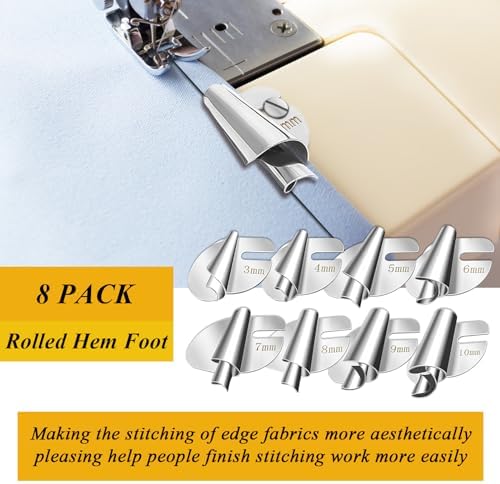 ❤[Multi Size For Choice]: 7/8/9/10 mm wide rolled hem pressure foot, different sizes can meet different size requirements. At the same time, the unique curling design can help you quickly fold and sew the edges of the fabric, making your sewing work more time-saving and labor-saving.
