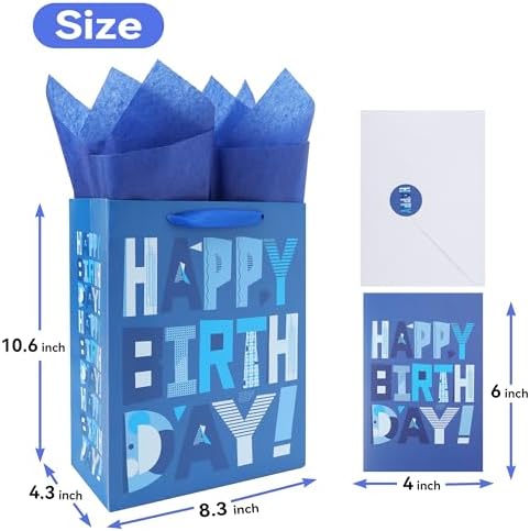 2 Pack 10.6” Medium Blue Gift Bag Set with Greeting Card and Tissue Papers (Blue Happy Birthday) for Men’s Birthday Party, Kids’ Parties, Baby Shower, or Baby Boy – 8.3”x4.3”x10.6”, 1 Pcs