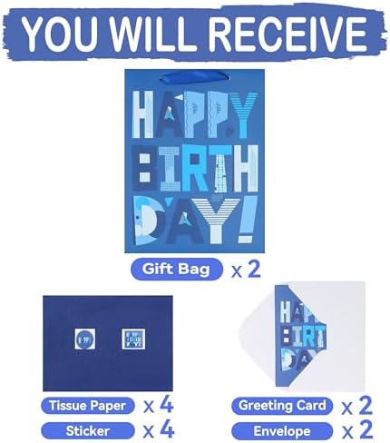 ULTIMATE SET FOR EASY GIFT GIVING: You will receive 2 medium gift bags, accompanied by 4 sheets of blue tissue paper for effortless wrapping or decoration. Additionally, you’ll find 2 greeting cards of the same design, complete with 2 accompanying envelopes, providing the perfect canvas for you to express your heartfelt wishes. The included 4 stickers add a sense of ceremony to your gift-giving experience.