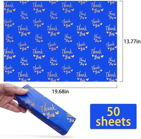 Package Includes:50 sheets navy gold thank you tissue paper bulk.Size:19.7 inch x 13.8 inch.Remind you that this size tissue may NOT be suitable for packing large size gifts.