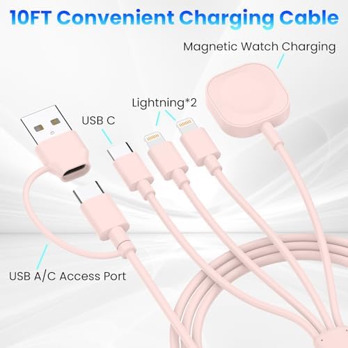 6 in 1 Magnetic Charging Cable for Apple Watch Charger, 10FT Multi Charging Cord for iWatch Ultra/SE/9/8/7/6/5/& iPhone 15/14/13/12/11/Galaxy/Pixel, Pink USB C Universal Cable Travel Essentials