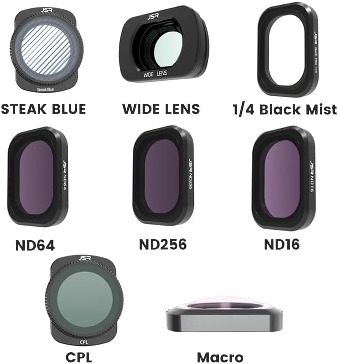 Set includes 8 types of filters “ND16, ND64, ND256, Wide Lens, CPL, 1/4 Black Mist, Steak Blue, Macro”.