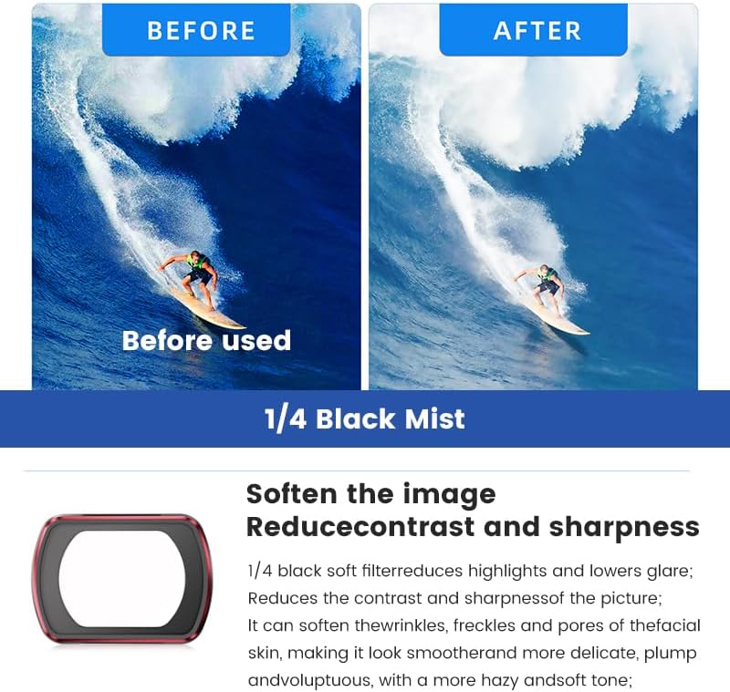 · Set includes 8 types of filters “ND16, ND64, ND256, Wide Lens, CPL, 1/4 Black Mist, Steak Blue, Macro”.