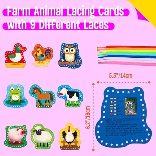 Cute Patterns & Smart Designs: The pattern covers diverse farm animals, like cow, duck, rooster, hen, owl, sheep, monkey, frog and horse. The illustrations on cards are big, vivid and vibrant. The holes are clearly cut and easy for preschoolers to work with. The strings are easy for children to use and fit into the holes easily.