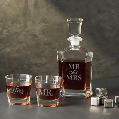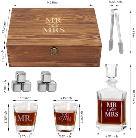 🎁【Unique Gifts】:A personallity whiskey gift set.The wooden box and decanter set are engraved with Mr and Mrs, Each piece is uniquely crafted, making it an perfect wedding gift that stands out from the rest.