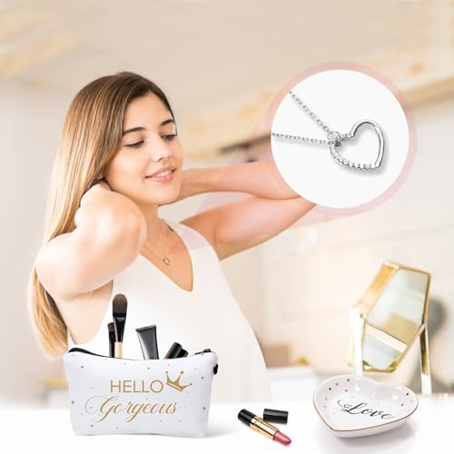 💕 A friendship gifts for women friends, include: 1 pink marble ceramic coffee mug, 1 jewelry tray, 1 silver necklace,1 English pear and freesia scented candle (soy wax candle), 2 rose bath booms, 2 lavender shower steamers, 1 note book, 1 diamond ball pen, 1 ‘hello beautiful’ cosmetic bag, 1 gift card and 1 gift box.