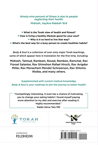 Body & Soul is a collection of over 180 major Torah teachings, some of which appear here in translation for the first time, including: Midrash, Talmud, Rambam, Ravad, Ramban, Ramchal, Rav Yisroel Salanter, Rav Shimshon Rafoel Hirsch, Rav Avigdor Miller, Rav Menachem Mendel Schneerson, Rav Shlomo Wolbe, and many others.