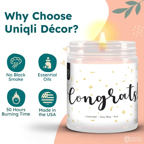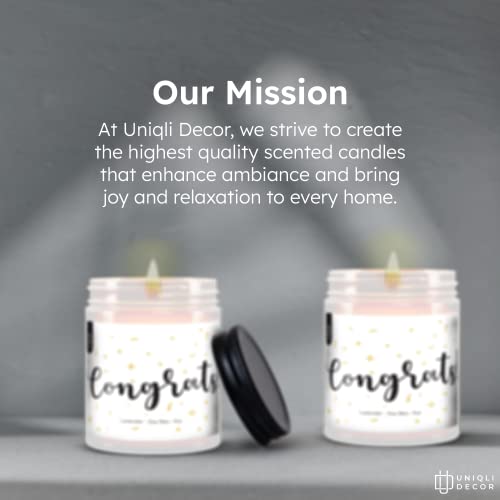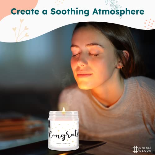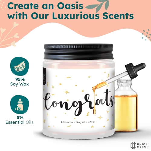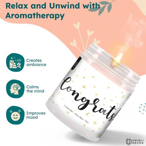 Congratulations Gifts Candles: This candle uses a unique Lavender Scent to help uplift your mood and add fragrance to your home. This blend of citrus essential oils even helps to reduce anxiety and depression!