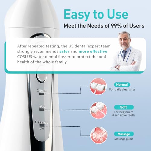 【 Deep Clean, Improve Gum Health, Freshen Breath 】 The COSLUS water dental flosser boasts advanced 0.3mm+0.3mm ultra-fine dual-thread water pulse technology, professionally endorsed by an American dental team. This water dental pick delivers high water pressure pulses at 1400-1800 times per minute, effectively removing 99.9% of dental plaque for deep teeth cleaning. This water dental pick massages the gums, promotes blood circulation, and addresses oral issues like bad breath, orthodontic teeth