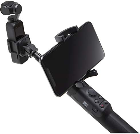 The OSMO Pocket Extension rod has A standard 1/4″mounting at the bottom connects Osmo Pocket with additional accessories. The OSMO Pocket Extension rod is designed with a mobile phone holder that can be used to secure the phone(the max width of the mobilephone is 83mm) and features a smartphone adapter slot.