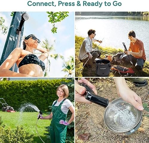 [Portable Shower Solution] Lightweight & compact camping shower kit, easy to carry for outdoor activities, like camping, hiking, pet cleaning, car washing, plant watering, window and backyard cleaning, or washing off sand on the beach. The pump weighs only 0.3 lbs, and it fits into other water containers perfectly.