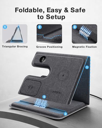 【Foldable & Travel Charger Stand】This JARGOU wireless charging station can be folded as a travel charger for multiple devices for Apple. JARGOU wireless charger has a compact size, this charging station is well built, fast charging, space saving, this travel charger for multiple devices can be put in a bag without taking up space. If you are looking for a charging station for iPhone 15 14 13… to help save space or declutter your desk, this 3 in 1 charging station for apple products is exactly what you need!