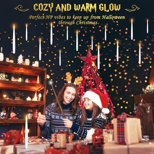 🧙 𝐅𝐋𝐎𝐀𝐓𝐈𝐍𝐆 𝐂𝐀𝐍𝐃𝐋𝐄𝐒 𝐖𝐈𝐓𝐇 𝐖𝐀𝐍𝐃 𝐑𝐄𝐌𝐎𝐓𝐄 – Want to replicating the iconic dining hall with floating candles scene from your favorite movie? Just got these flickering hanging candles, simply wave the wand, light up floating candles like a wizard, and watch the led candles flickering realistic in air. For an even more immersive experience, pair them with RGB strips that simulate lightning and clouds or floating hats, it will transform your space into a magical wonderland.