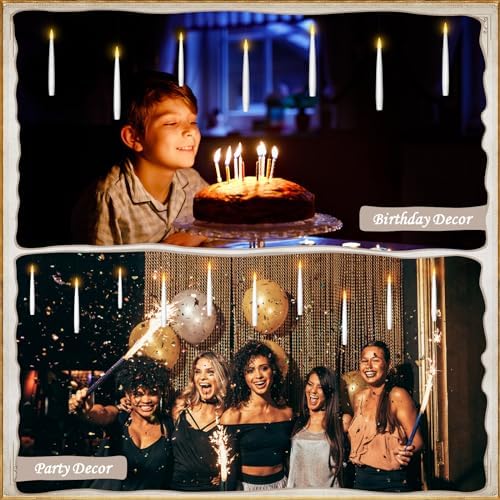 💕 𝐂𝐑𝐄𝐀𝐓 𝐀 𝐖𝐀𝐑𝐌 𝐀𝐌𝐁𝐈𝐄𝐍𝐂𝐄 – These flameless floating candles effortlessly creat a cozy and inviting lights. The hanging led candles lights are not overly bright, perfect for watching movies and still be able to see. Create a captivating romantic atmosphere on Valentine’s Day and a soothing warmth during holiday celebrations. They’re perfect for infusing your home decor, parties, weddings, birthday, or themed events with a touch of magical charm.