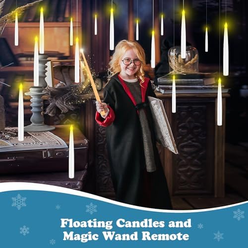 Magical Chirstmas Gifts for Kids: These flameless candles with magic wand remote are packed in a high-grade gift package wihch is an amazing Christmas magical gift for your kids to play with magic fun. The hangging candles with a magic wand remote will bring a feel of the magical world! Package Set : You will receive 12 pack 6.65 inch tall and 0.63 inch diameter LED candles with pre-attached fishing line , 1 magical wand remote, hooks and pushpins.