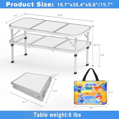PORTABLE CAMPING TABLE: (PLS CHECK SIZE CAREFULLY) This travel table weighs 5.7 pounds,camping table pack size is 15.7″x11.8″x3.7″.Open size 15.7″x35.4″x10.6″, max load capacity: 60 lbs.Its with handles for easy carrying and small size after folding make it easy to carry and store.