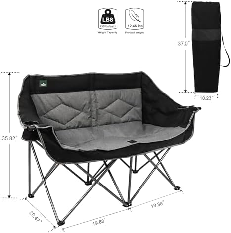 𝗢𝗩𝗘𝗥𝗦𝗜𝗭𝗘𝗗 𝗦𝗘𝗔𝗧: Oversized loveseat camping folding chair open size is 35.82 x 20.47 x 39.76 inches,and it’s 37×10.23×10.23 inches when folded. Weight 12.46lbs,Weight Capacity 300 LBS (136 KG ) Per Seat