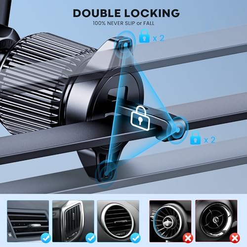 【Easy to Install & Adjust】The phone mount can be easily adjust the hook length to lock into the vent by twisting the knob on the phone holder. The phone car mount extension arm can be adjusted at any angle and the flexible swivel ball head allows 360-degree rotation. Moreover, the phone can be rotated for horizontal or vertical use, completely hands-free, ideal for long-distance driving, and hands-free phone calls.
