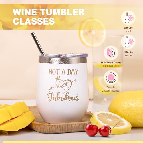 A 12oz wine tumbler with “Not A Day Over Fabulous” & straw