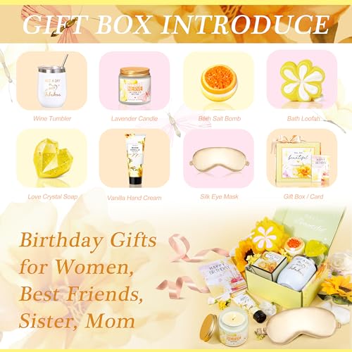 🌼 Sending A Sunshine In A Box – This birthday gift baskets contains 8 gifts which value $90.92 and designed to provide a pampering experience that every woman deserves. A 12oz stainless steel tumbler with “Not A Day Over Fabulous”, a straw, a lavender scented candle, a vanilla hand cream, a silk eye mask, a bath salt bomb, a diamonds soap, a bath loofah, a gift box & silk ribbon, a greeting card.