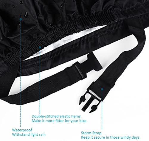 ★【Stay On During High Winds & Anti-theft】 Elasticated front – middle – back hems and buckle on the middle to keep the cover in place during high winds. Two lock-holes at the front wheel area that can be used with your bikes for a double security from bike theft while providing an adequate protection from adverse weather conditions. Bottom double-stitched elastic hem and special designed buckle for a snug fit keep it secure on those windy days.