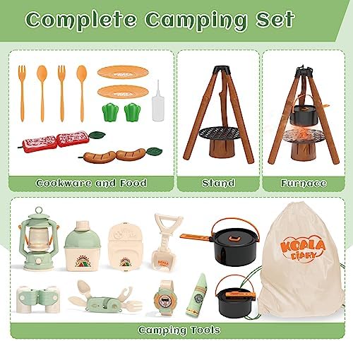 🏕️RICH CAMPING TOYS FOR KIDS: This pretend play camping set for little campers includes a pretend stove set, cooking pots, food toys, plates, collapsible fork spoon, oil lamp, binoculars, watch, 3-in-1 compass flashlight whistle, shovel, storage bag and more. Plenty of fun accessories to keep your little one entertained for hours. Whether indoor or outdoor, they can experience a fun camping trip.