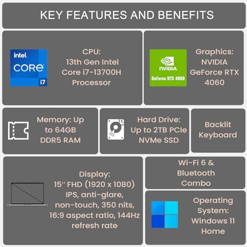 【Processor】Intel Core i7-13700H (14 Cores, 20 Threads, Base Frequency at 1.8 GHz, up to 5.0 GHz), NVIDIA GeForce RTX 4060 (8GB GDDR6 Memory)