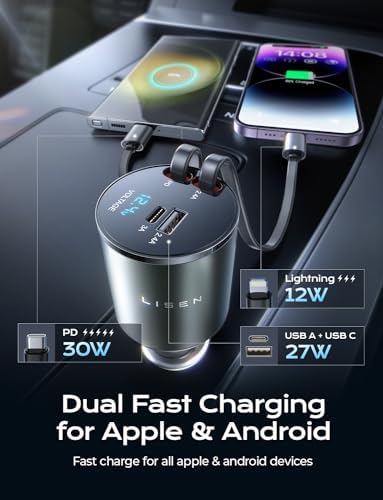 ⚡ 69W 4-Port Charging Powerhouse: The LISEN 69W Car Phone Charger multi port, with its PD 30W USB C and 12W USB Lightning retractable cables, alongside a 15W USB C and a 12W USB A port, delivers high-efficiency charging for four devices simultaneously. It’s ideal for the latest iPhone 14/15 series, Samsung S24/S23/S22 series, and other compatible Apple and Android devices, featuring advanced PPS PD30W and QC3.0 fast charging protocols for six times faster charging than traditional chargers.
