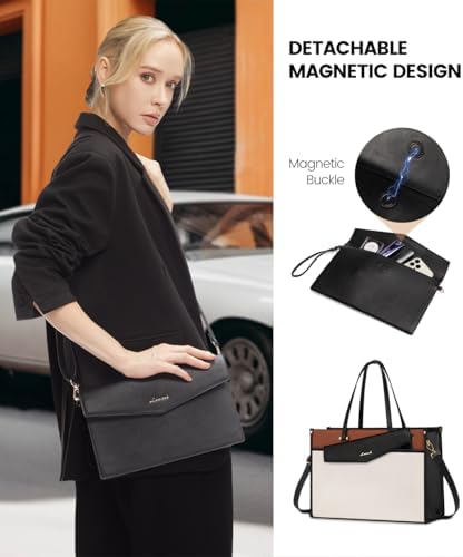 👝Detachable Magnetic Clutch Purse👝: 2-in-1design enhance your work tote bag’s aesthetic with a functional front envelope clutch that doubles as a decorative accessory. The detachable magnetic clutch transitions smoothly from being an integral part of the laptop tote bag for women to a standalone fashionable wallet, clutch, or wristlet, offering convenience and versatility for your day-to-day styling.