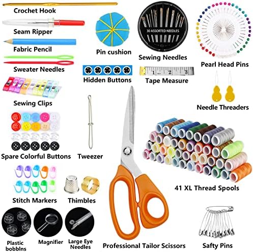 【TOP-CLASS SEWING SUPPLIES】 There are 41 thread reels including 5 rainbow reels in this professional sewing kit. The multi-color thread reels are ideal for daily use and repair. The package has also included: sewing pins, pin cushion, spare buttons, large eye needles, locking stitch markers, sewing clips, hidden buttons, plastic bobbins, plastic needle threader, thimbles, magnifier, measuring tape, stainless steel scissors, seam ripper, knitting needle, tweezers, crochet hook and fabric pencil.