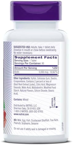 Natrol Beauty Biotin 5000mcg, Dietary Supplement for Healthy Hair, Skin, Nails and Energy Metabolism, 90 Strawberry-Flavored Fast Dissolve Tablets, 90 Day Supply