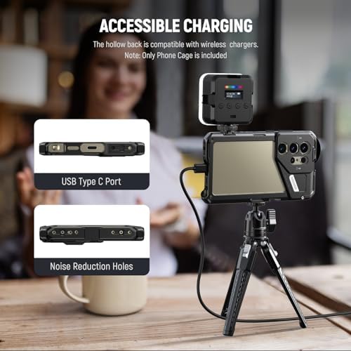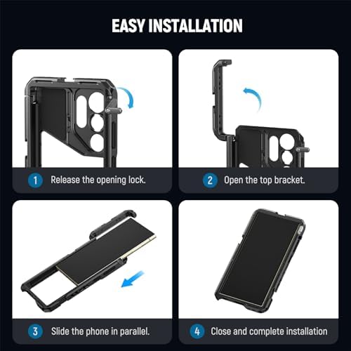 【1 Click Installation with Full Access】 This integrated phone cage quickly opens and locks via a side button and fits seamlessly with the S24 Ultra without blocking the camera, charging port, and function buttons. Lined with shock absorbing rubber cushions, it is a protective and versatile phone stabilizer for video recording indoors and outdoors