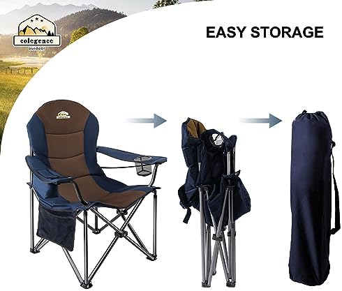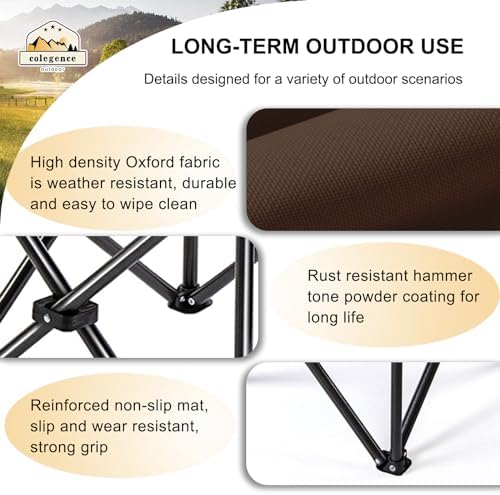 【 STABLE AND SECURE 】Our extra-large,high-quality folding chairs offer a secure and pleasant outdoor experience. Our Colegence camping chair features sturdy thick-reinforced steel supports (50% thicker than usual) and reinforced safety fasteners,enabling it to withstand up to 400 pounds,which is more than double the weight of an average individual.Ensure that the outdoor chair is built to withstand the elements and last for a long time.
