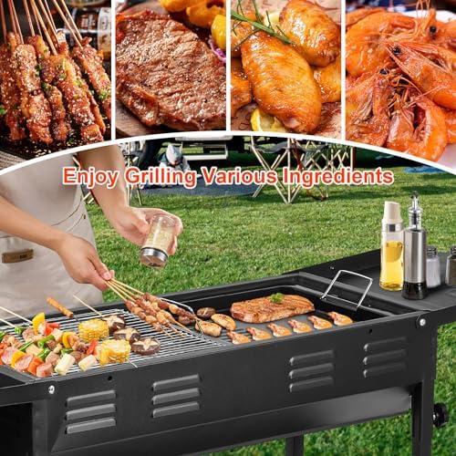 🍖[High-Quality Portable Charcoal Grill & Spacious Size]: Made of premium aluminum + stainless steel material with matte black design, this grill is not only aesthetically pleasing but also durable. The unfolded dimensions of the portable grill are 47.2″ (L) x 11.8″ (W) x 25.6″ (H) inches, making it spacious enough to feed 5-15 people. perfect for camping, parties, backyard gatherings, and RV trips, allowing you to easily prepare and enjoy delicious food outdoors.