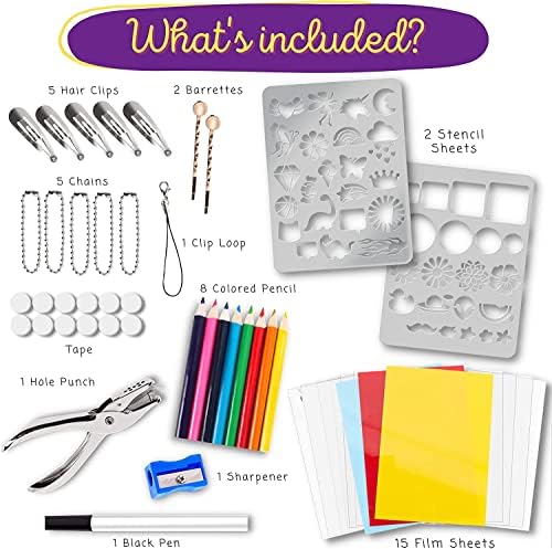 COMPLETE CRAFT SET! The 53-piece set includes 15 printable shrink paper sheets, pencil crayons, a marker, hair clips, barrettes, a pencil sharpener, tape, stencils, and even a hole punch. Perfect DIY craft supplies for kids!