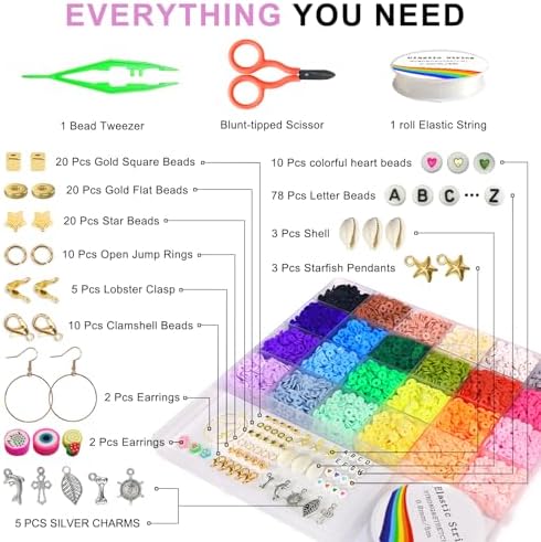 🌸BRACELET MAKING KIT: All you need included,about 4000 pcs flat polymer clay beads and 200 pcs pendant set( contains letter beads, colored heart beads, Gold beads, shells, lobster claspetc.)1 rolls stretchy strings, a scissors, 1 plastic tweezer , to meet all your needs for bracelets making & jewelry making.