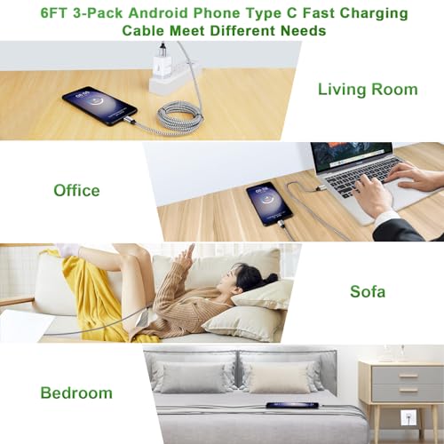 【3-Pack 6FT Samsung Android Phone Charger Power Cord】Nylon braided technology reinforces cord’s durability, not easy to break and crack. USB Type C fast charging cable provides an extension for use, perfect for travel, home and office. Perfect 6ft long cord is enough for you to use without being restricted by the power socket location. The samsung galaxy a15 5g type c fast charging cable support from both sides, can be inserted “positive and negative insert” function.