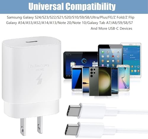 【Super Fast Charger Compatibility】The USB C fast wall charger cable kit supports most of most of USB C devices, including Galaxy S24,S24 Ultra,S24+,S23,S23+,S23 Ultra,S23 FE,S22,S22+,S22 Ultra,S21,S21 Ultra,S21+,S21 FE,S20,S20+,S20 Ultra,S20 FE,Z Fold 2/3/4/5,Z Flip 5/4/3/2,S10,S10e,S10+,S9,S9 Plus,S8,S8 Plus,Note 10,Note 10+,Note 20,Note 20 Ultra,A90,A80,A71,A70s,A54,A53,A52,A51,Google Pixel,Pixel 2,Pixel 3,Pixel 4,Pixel 5L,Pixel 6L,Pixel 7,Pixel 8,LG G7,LG G8,LG G6,LG G5 And more USB-C Devices.