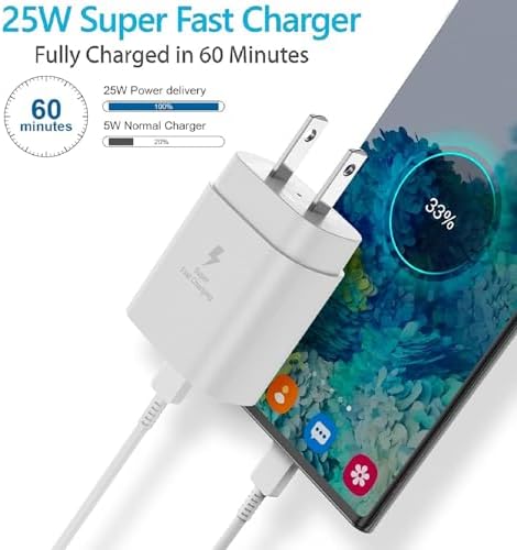【Super Fast Charger Type C】25W PD 3.0 Technology provides Max 25W output power for all Galaxy S24/S23/S22/S21/S20/Ultra/Plus/FE/Z Fold/Z Flip/Note 20/Note 10 Fast Charge Your battery from zero up to 100% in about 60 min,5 times as fast as Standard Charger Block,10 times as fast as PC USB port and saves you time.