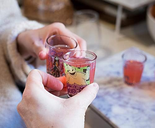 MINI-GLASS SET: Our 4 piece mini-glass set set holds 1-ounce of your favorite beverage in each glass and features the images of the Pumpkin King Jack Skellington, his undead bride Sally, the loveable and perfect Zero, and the horrifying Oogey Boogie