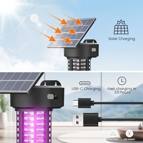 Solar & USB C Charging: The solar mosquito zapper outdoor equipped with solar panel and 1800mAh rechargeable battery, it offers a fast charge option via any USB device in just 3.5 hours, this bug zapper can last 15 hours by fully charged.