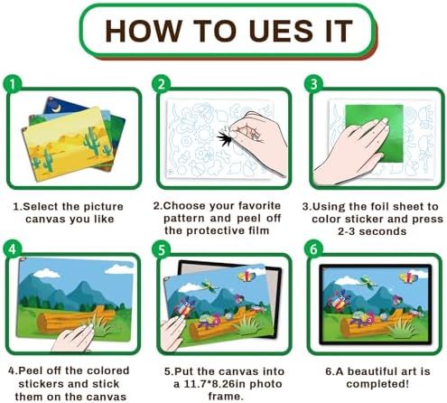 【Easy to use】Choose a picture, select stickers and apply color using sparkly foil sheets. Add as many as possible various amazing stickers , and make it to bring you to the foil fun picture life! Whether at home or on the go, this kit is versatile and portable, providing creative entertainment wherever your child may be.