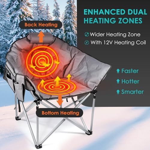 【Advanced 3-Level Dual Heating Zones】The heated chairs feature three heating settings (green for low, blue for medium, and red for high), providing personalized comfort. The dual control buttons allow separate adjustment of the temperature for the back and seat positions, customizing the warmth to your preference. The heated camp chair utilizes a 12V DC heating coil, smarter, faster, and hotter. 10 seconds heated and the warmth safely penetrates the body.