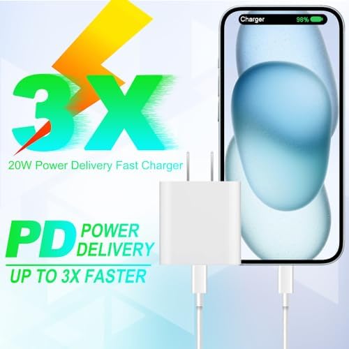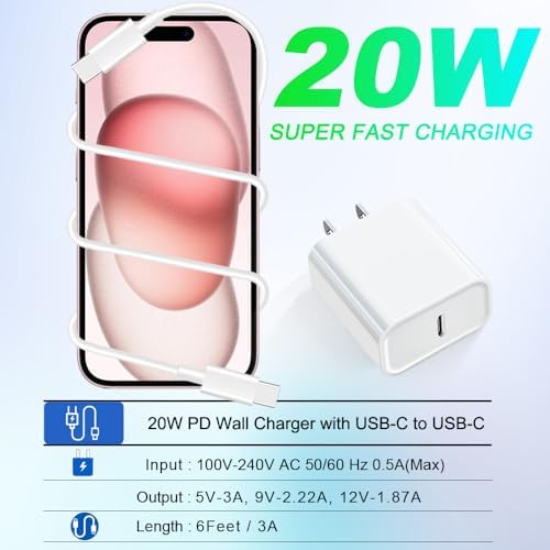 20W Fast Charger USB C Wall Charger Block with 6FT Extra Long USB C to C Fast Charging Cable for iPhone 15,iPad Pro / Air / Mini, Google Pixel