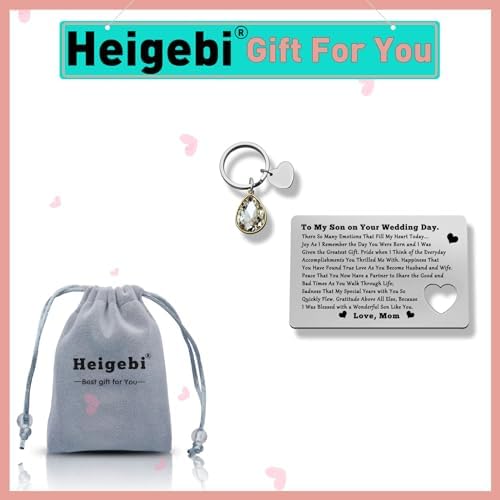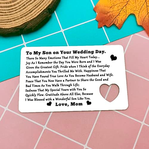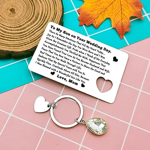 Wedding Gift for Son from Mom : Wallet insert card and an additional cutout keyring. Each set gift will arrive in a nice velvet bag. It can be given to your son as a surprising gift directly and yourself. To my son on your wedding Day. There so many emotions that fill my heart today…