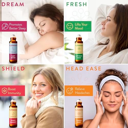PREMIUM QUALITY THERAPEUTIC GRADE ROLL ON ESSENTIAL OILS SET: Essential oil blends include 100% gentle and pure essential oils: Sleep, Shield, Fresh, and Head Ease. Steam-extracted right from the source and packaged in the USA without any additives, toxins, or harmful chemicals. Blended with Carrier Oils. GMO Free, Cruelty Free, and never tested on animal: s.