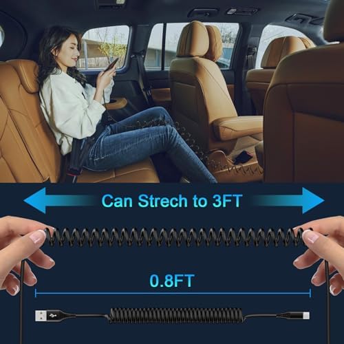 【Coiled Type C Cable for Car】:Coiled usb c cable supports connection with Android Auto or Carplay,galaxy s24 ultra usb to usb c cable features a retractable design, allowing you to extend it to the desired length when needed. Its natural length is 1 foot, and it comfortably extends to approximately 1.5-2 feet, with a maximum extension of 3 feet. It doesn’t tangle or knot, retractable car phone charger making it easy to store and saving space inside your vehicle,perfect for your different needs and bounce back to normal length well.